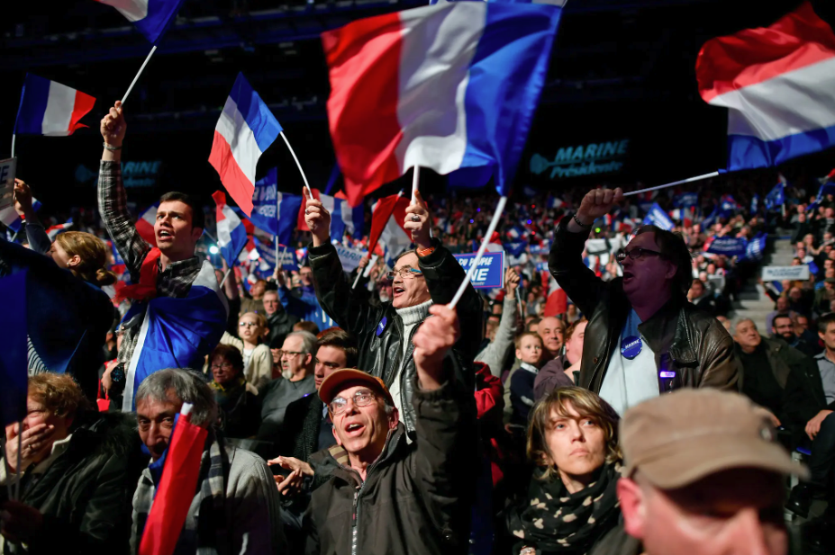支持者在法国里昂参加极右翼政治人物、国民阵线领导人玛丽娜·勒庞竞选集会的场景。图源:Getty Imagies