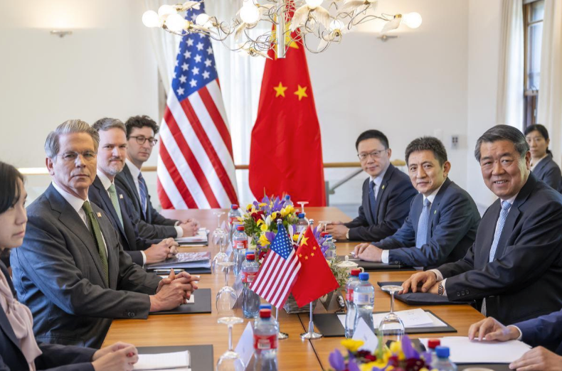 5月11日,中国国际贸易谈判代表李成钢(右二)和中国国务院副总理何立峰(右)与美国财政部长斯科特·贝森特(左)、美国贸易代表杰米森·格里尔(左二)、中国财政部副部长廖岷(右三)在瑞士日内瓦举行会谈。图源:AFP
