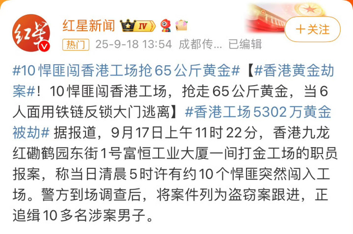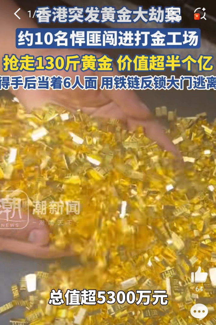 这起案件并非香港首次发生黄金劫案。早在2016年就发生过巨额金条抢劫案。业内人士指出,黄金运输及加工环节的安保漏洞,早已成为不法分子的“财富密码”。警方呼吁金融及贵金属行业从业者加强安保,西九龙总区警司直言:“任何可疑人员或车辆接近工场,都应立即报警。”