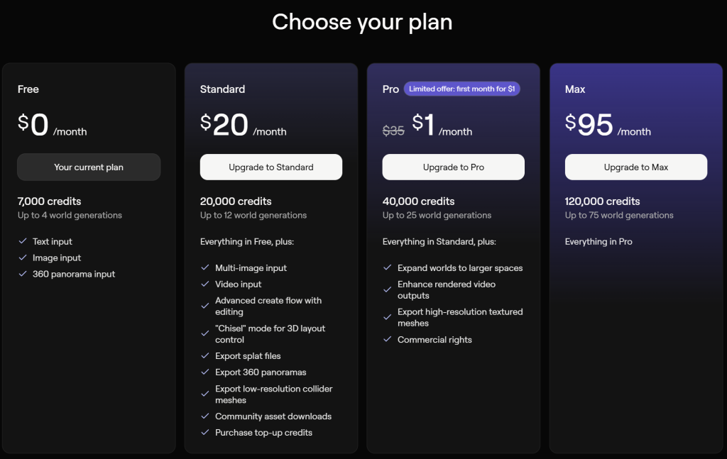 在付费方面,Marble设有四大订阅计划:免费版用户每月能够通过文本、图片或全景图输入进行4次生成;标准版每月收费20美元,能够解锁多图和视频输入以及高级编辑,包含12次生成额度;专业版每月收费35美元,目前有首月1美元的优惠,在标准版之上增加了场景扩展功能与商用权限,生成次数提升至25次;最高级的Max版每月收费95美元,生成额度提升至75次生成额度。