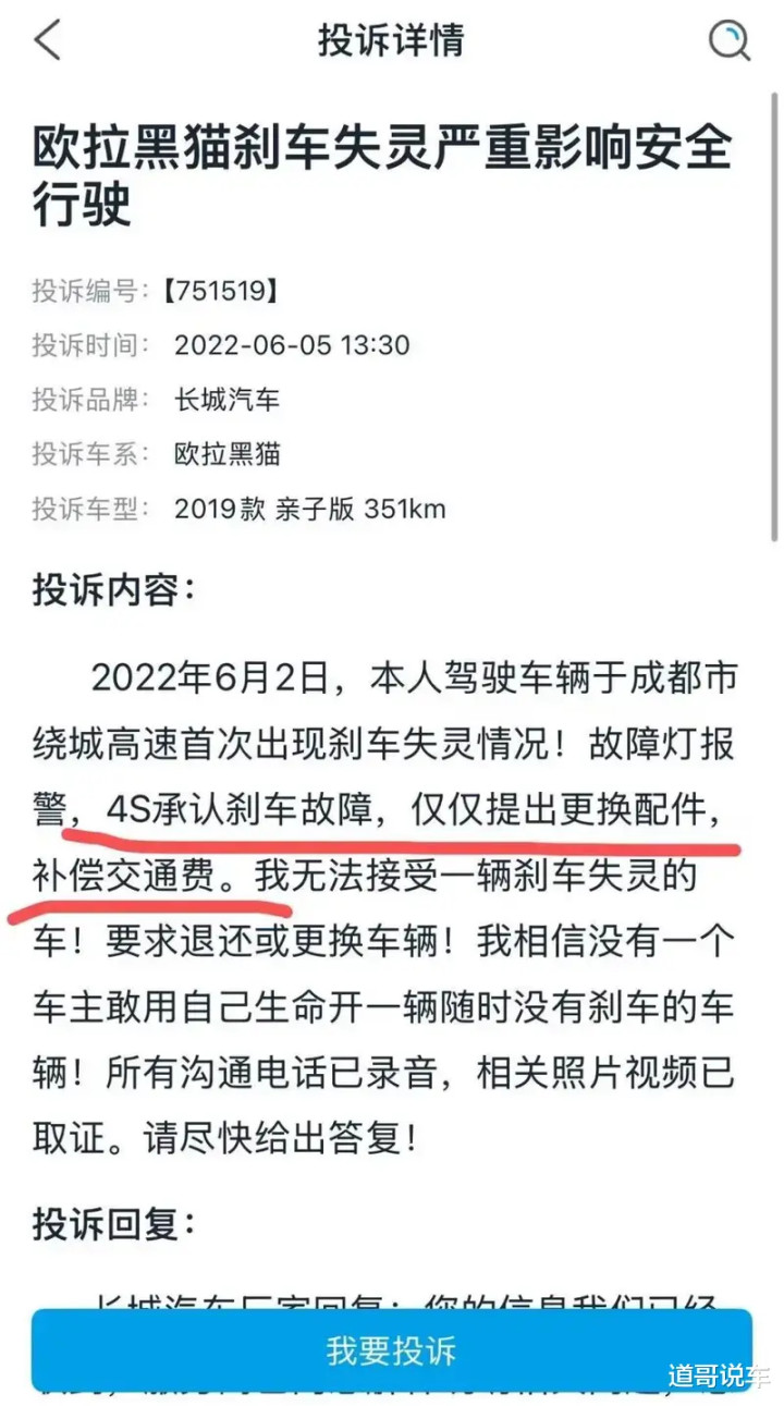 “2022年6月2日,本人驾驶车辆于成都市绕城高速首次出现刹车失灵情况!故障灯报警,4S承认刹车故障,仅仅提出更换配件,补偿交通费。我无法接受一辆刹车失灵的车!要求退还或更换车辆!我相信没有一个车主敢用自己生命开一辆随时没有刹车的车辆!”