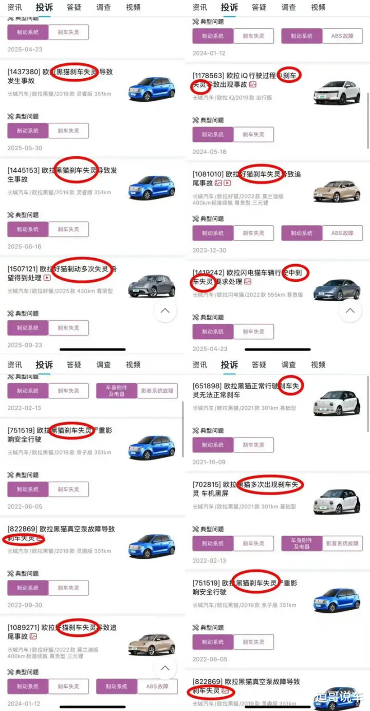 说“刹车失灵”是欧拉的“遗传病”,并非空口造谣,更非夸张叙事。在车质网的投诉案例里,刹车失灵不止发生在欧拉旗下一款车型里,好猫、黑猫、闪电猫,iQ,都存在着不少相关投诉。