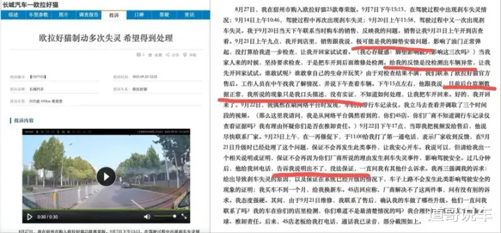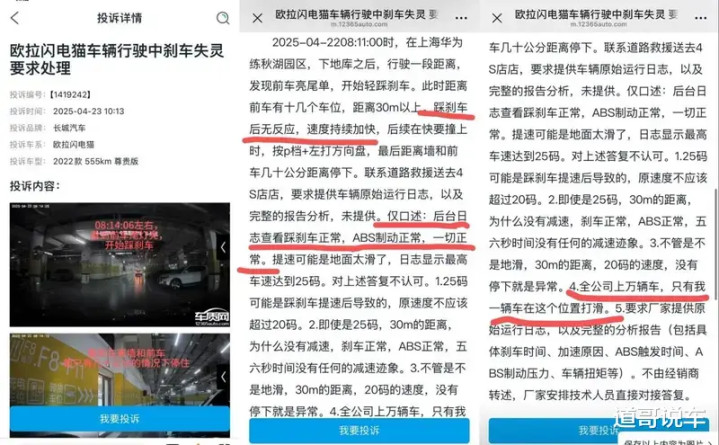 9月23日,车质网的投诉记录。宿州车主购入2025 款欧拉好猫仅半月,便遭遇三次刹车失灵,4S店先归咎“脚垫问题”,后以“后台数据正常”搪塞,直至车主自行调取行车记录仪视频,厂家才承认 “已通过升级处理”,却拒绝出具安全保障说明。