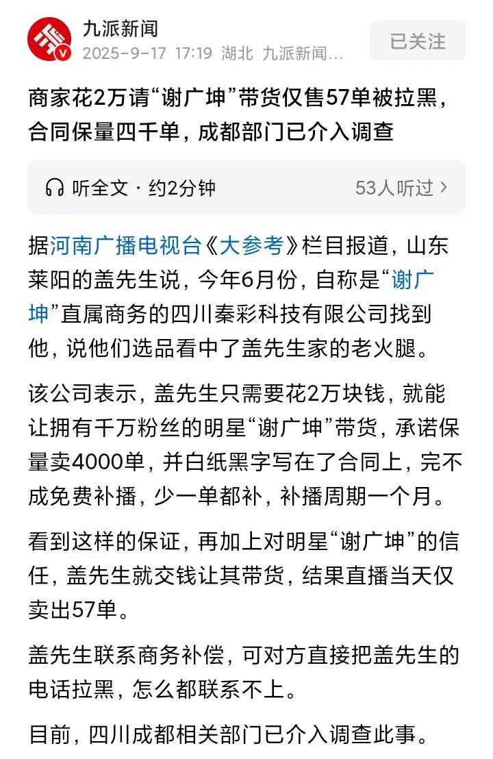 赵本山徒弟谢广坤摊上事了,主动联系商家带货,收了2万佣金,却只卖出去57单。